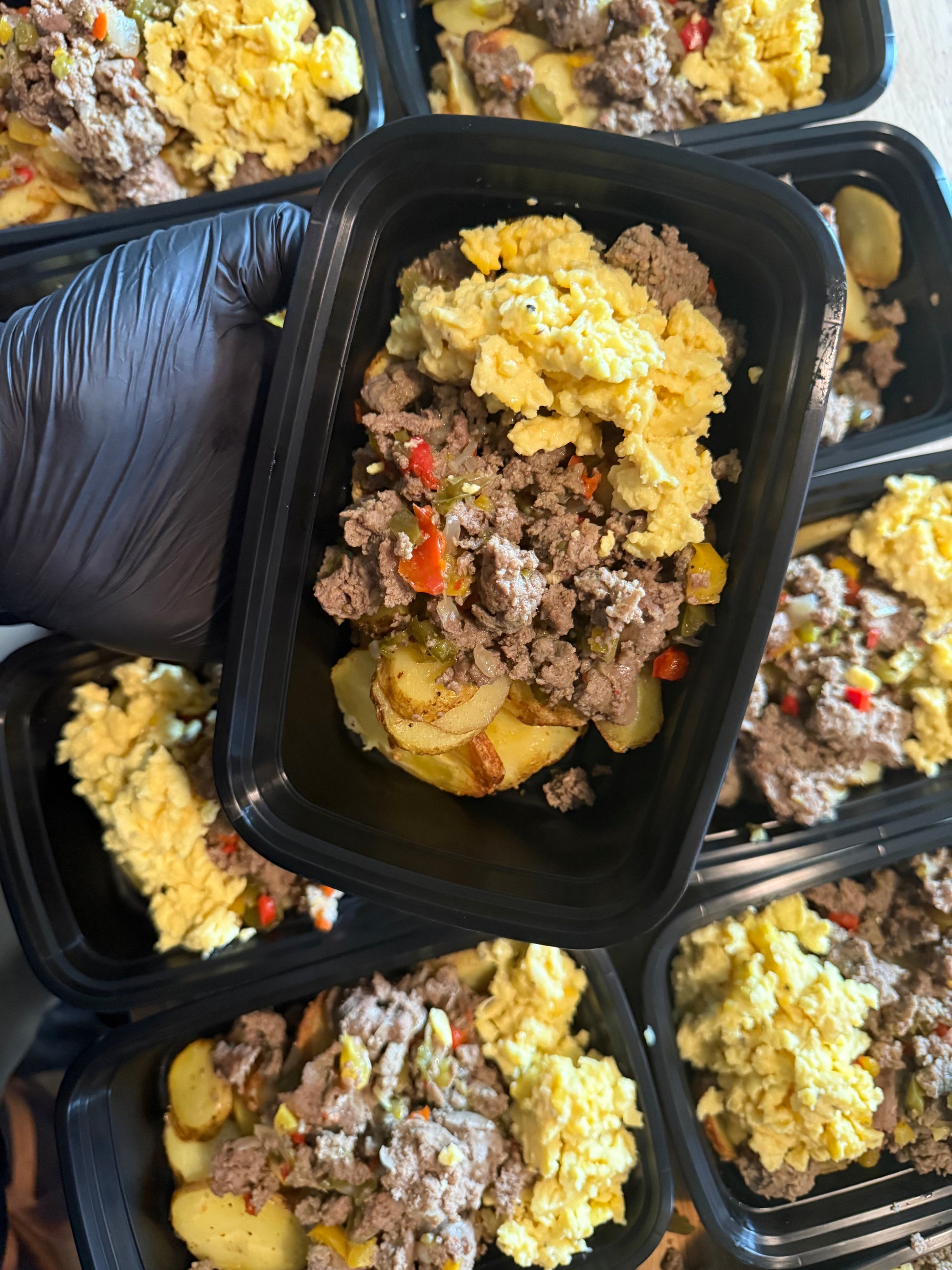 Fluffy eggs, turkey sausage, and crispy roasted potatoes topped with roasted peppers, a drizzle of Creamy Siracha