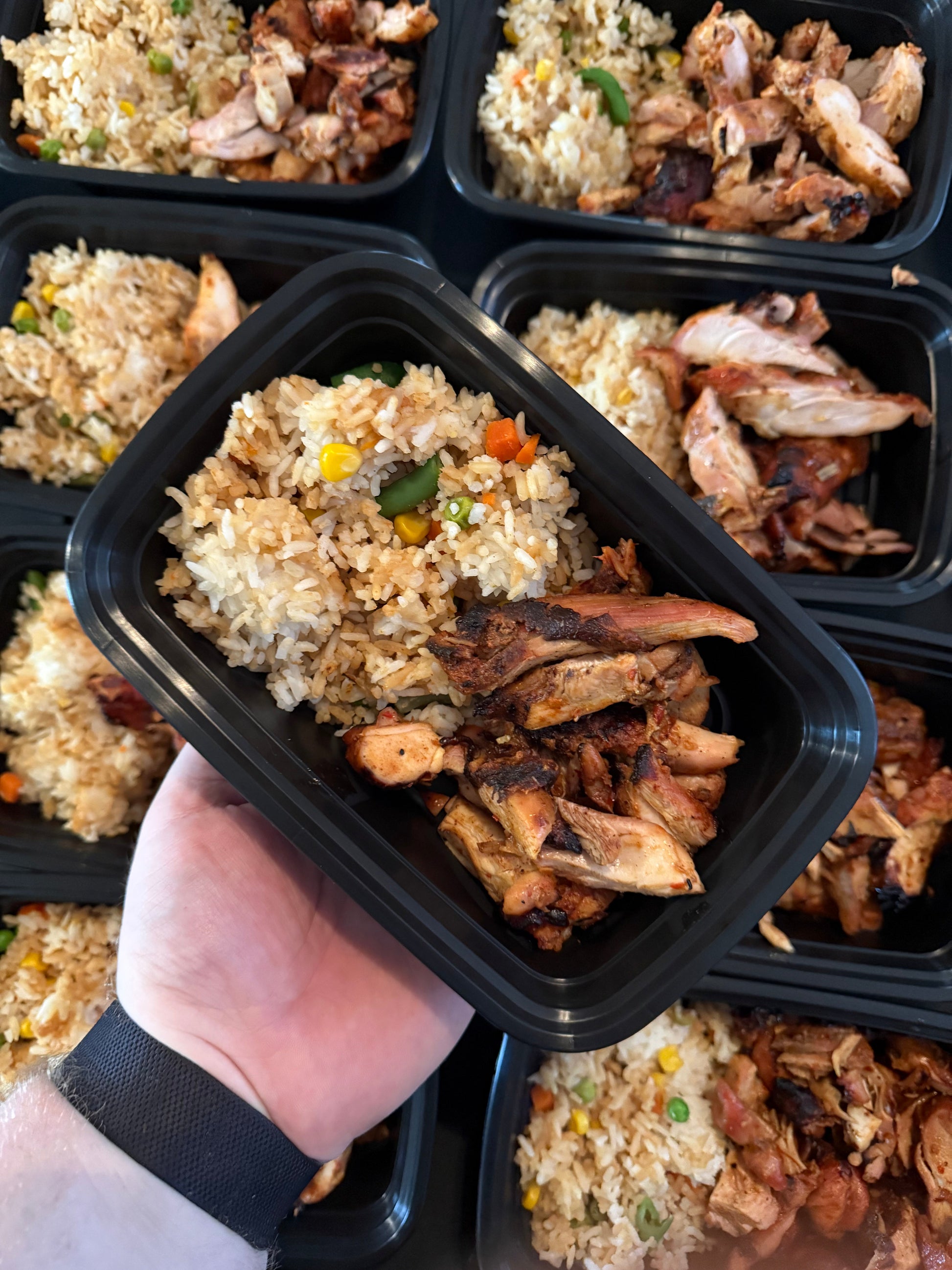 Marinated grilled chicken served with white rice and crisp veggies, infused with bold Thai-inspired flavors.